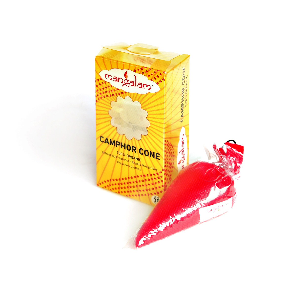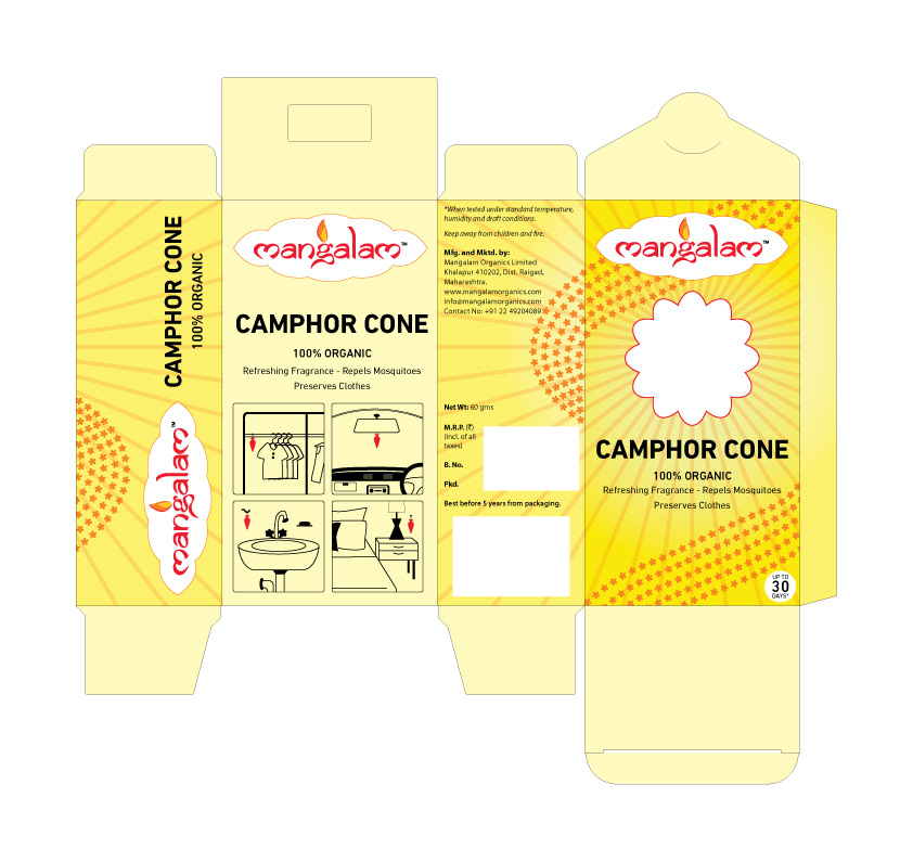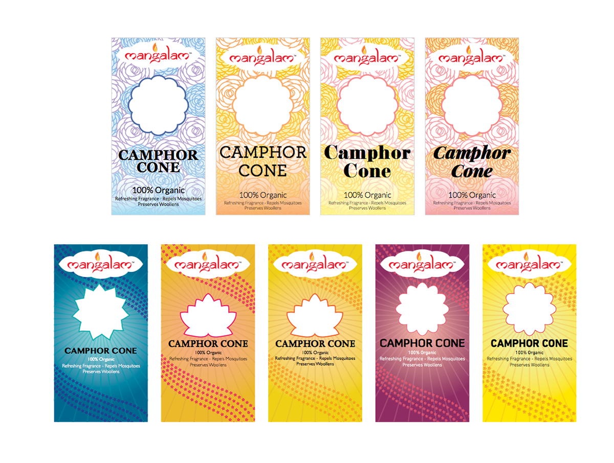 Packaging for the Mangalam Camphor Cone that can be used to keep away bad odors and mould in musty places. The product is targetted to middle income level house wives.